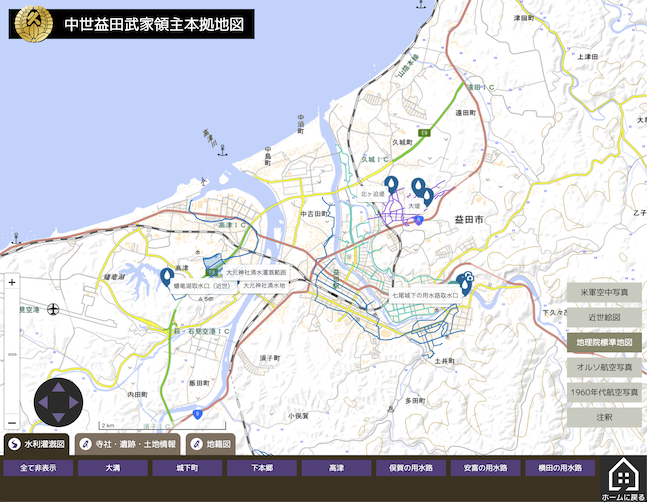 2022年、国立歴史民俗博物館で開催された企画展示「中世武士団 ― 地域に生きた武家の領主 ―」で展示された、中世の益田における武家領主本拠および水利灌漑と土地利用の状況等を、現在の地図等と重ね合わせたものをWeb版に改良したものです。島根県益田市で実施した現地調査の成果です。 開く