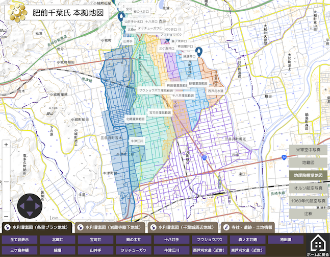 2022年、国立歴史民俗博物館で開催された企画展示「中世武士団 ― 地域に生きた武家の領主 ―」で展示された、中世の小城における肥前千葉氏の本拠および水利灌漑と土地利用の状況等を、現在の地図等と重ね合わせたものをWeb版に改良したものです。佐賀県小城市で実施した現地調査の成果です。 開く